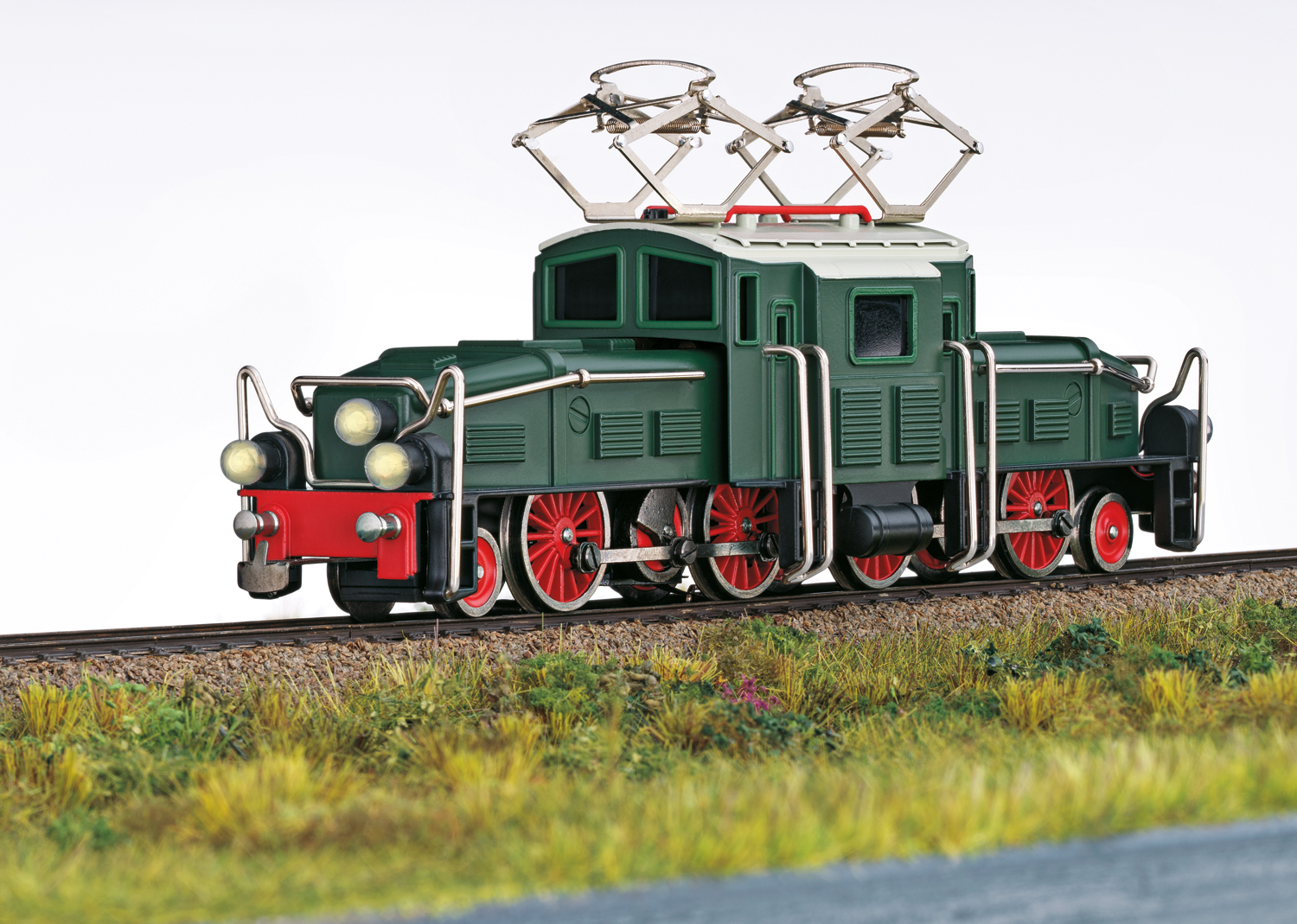 This is a reproduction of the first H0 Gauge Crocodile prototype ever made at Märklin from 1936. The frame and body are constructed of die-cast zinc. Both trucks are powered with jackshafts and side rods. The locomotive has a factory-installed mfx decoder, so that it can be used on present day layouts. Sufficient clearance must be ensured due to the reproduction of this historic sample. The headlights change over with the direction of travel and will work in analog operation. There are sprung pantographs without an electrical function. Length over the buffers 21 cm / 8-1/4".